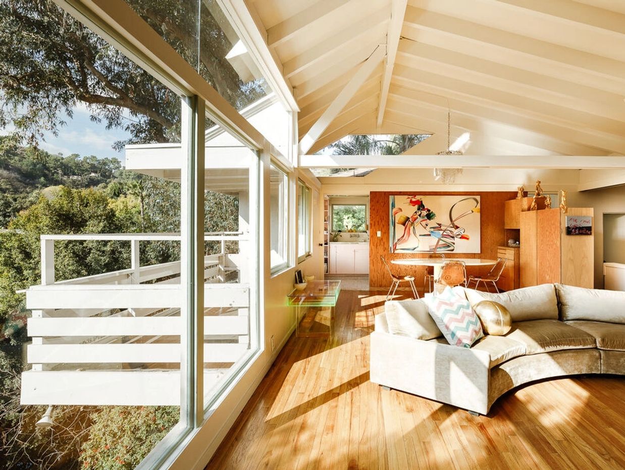 The Druckman Residence, designed by Rudolph Schindler in 1941, is one of the most distinguished examples of modern architecture. Dr. Jacob S. Druckman and his wife Margaret asked the architect for a house with privacy and plenty of natural light and the result is a classic example of Schindler's mastery of geometry and balance, tucked into the secluded Outpost Estates of the Hollywood Hills. The residence is accessed through a gate leading to a private Japaneese style garden. Upon entry, visitors are greeted by an expansive, open-plan living and dining area, seamlessly connected to the kitchen, with a split-level transition to a powder room and guest bedroom.