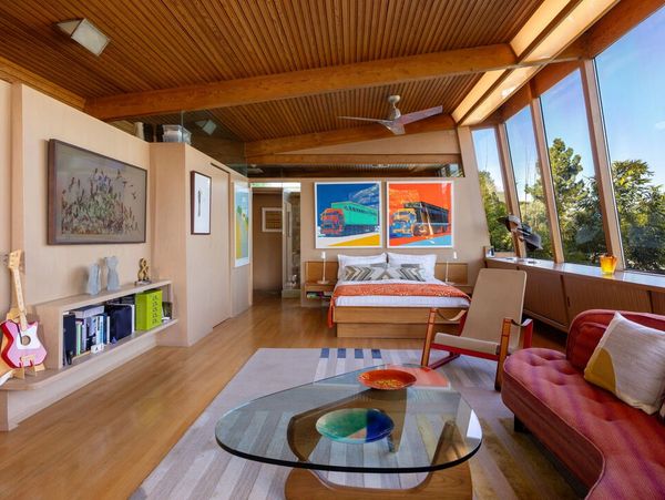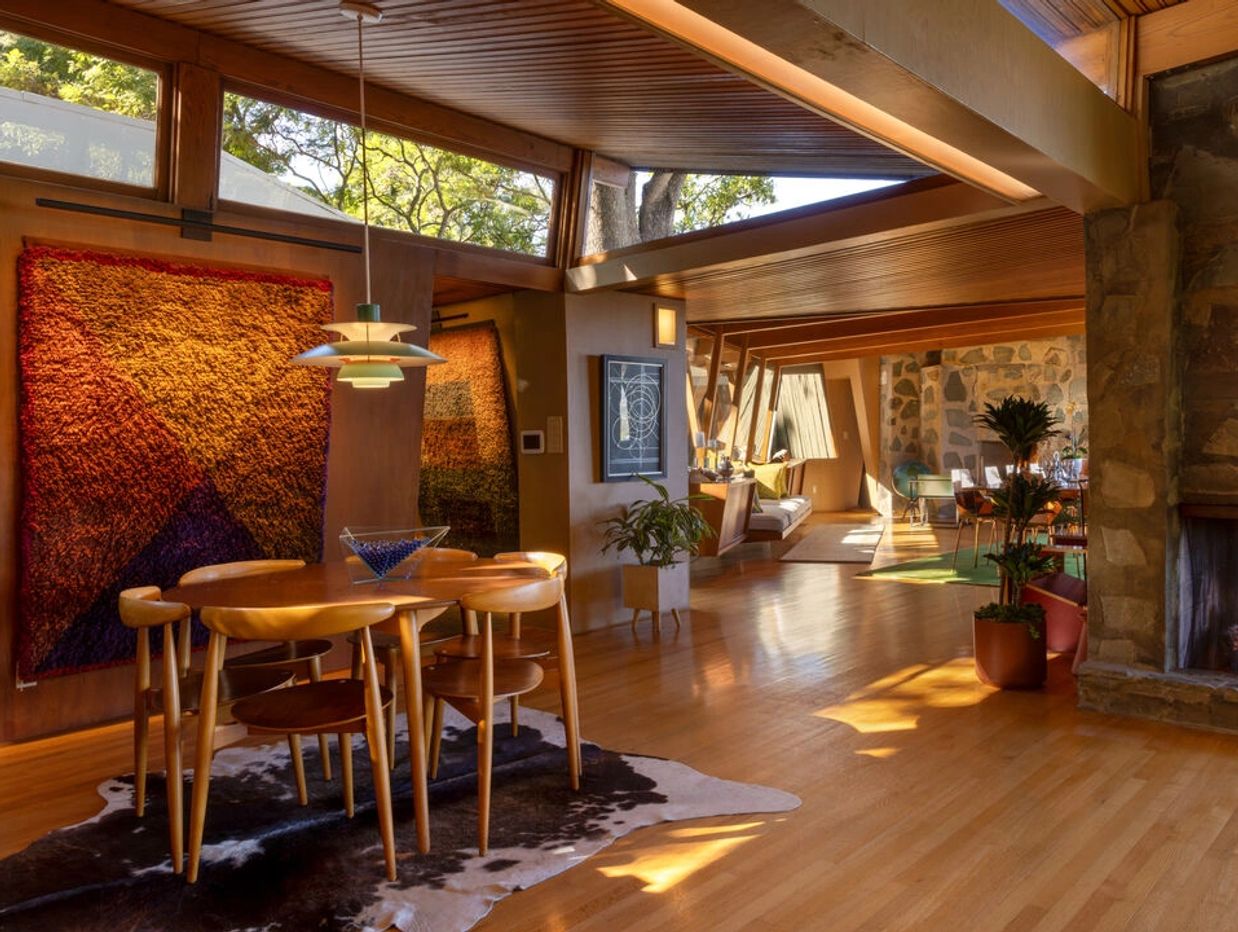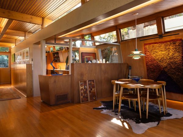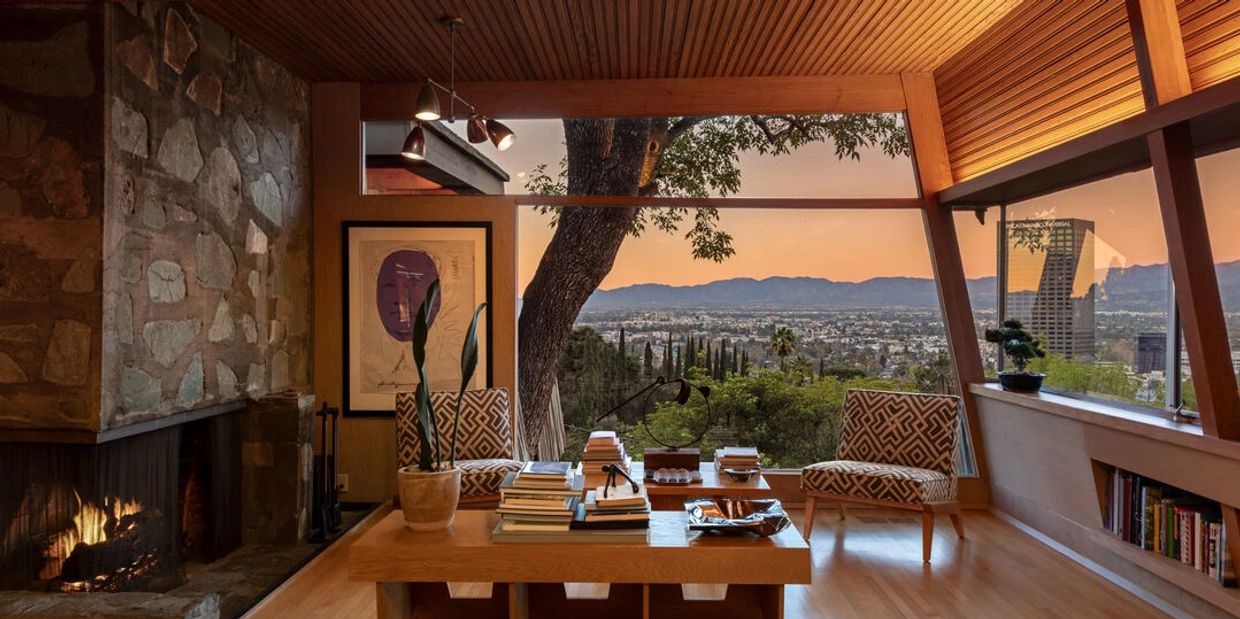 Designed in 1946 by renowned architect Rudolph Schindler, the Kallis-Sharlin Residence is a striking example of site-driven modernism, dramatically set into a steep hillside with expansive views over the San Fernando Valley. Originally built for artist and film art director Mischa Kallis, the home follows the natural contours of the land, with layered volumes, terraces, and walls of glass that connect the interiors to the surrounding landscape. Inside, Schindler's signature design language is on full display, with unconventional angles, abundant natural light, and a strong sense of flow between spaces. The iconic butterfly roof brings in clerestory light throughout the home, while warm materials - most notably mahogany and Douglas fir walls, ceilings and built-in furniture - add richness and character. Distinctive grape-stake cladding wraps portions of the exterior, allowing the home to blend seamlessly into its wooded setting while enhancing privacy. Additional features include four fireplaces, a spa-like steam shower, a mahogany soaking tub, a glass-enclosed office, climate-controlled basement storage, a rare private bocce court and a swimmers pool and jacuzzi. Designated Los Angeles Historic-Cultural Monument #860, the Kallis-Sharlin Residence underwent a thoughtful, multi-year restoration from 2017-2022 in collaboration with Barbara Bestor and Jeff Fink. The result is a beautifully preserved and highly livable architectural landmark - offering a rare opportunity to own a significant and celebrated piece of Los Angeles design history.